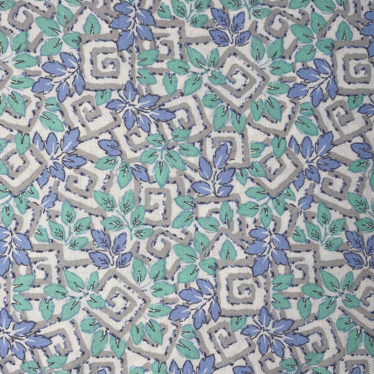 Coronation Gardens is a geometric and floral pattern in blues & green.