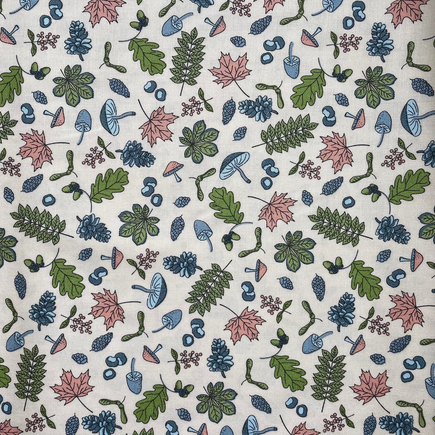 Woodland Forage is a lovely autumnal woodland print depicting mushrooms, acorns, foliage, sycamore wings, conkers etc.