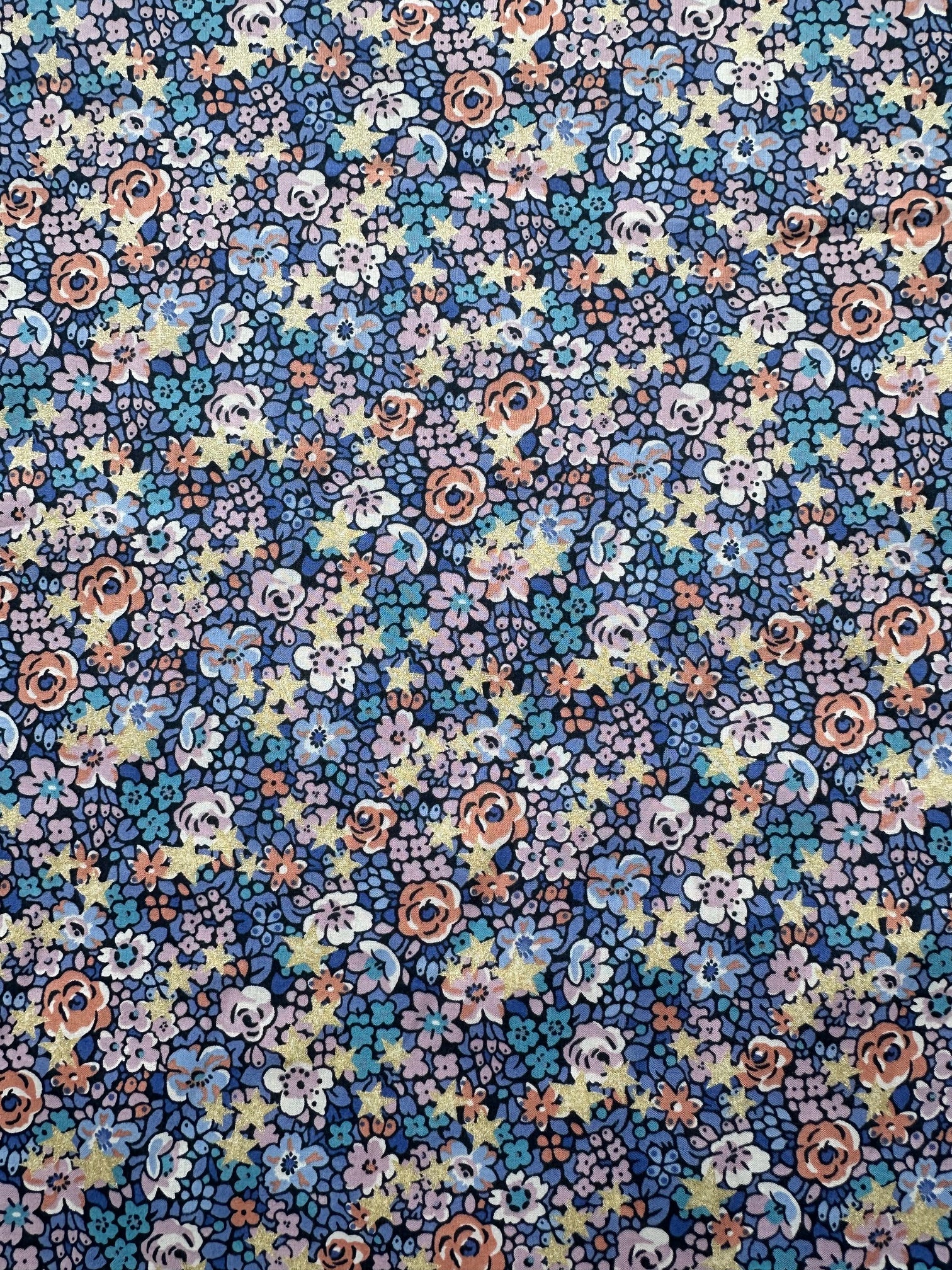 Liberty Tana Lawn - Emma Etoile Star print has beautiful florals in blues, lilacs and orange with a gold star motif.