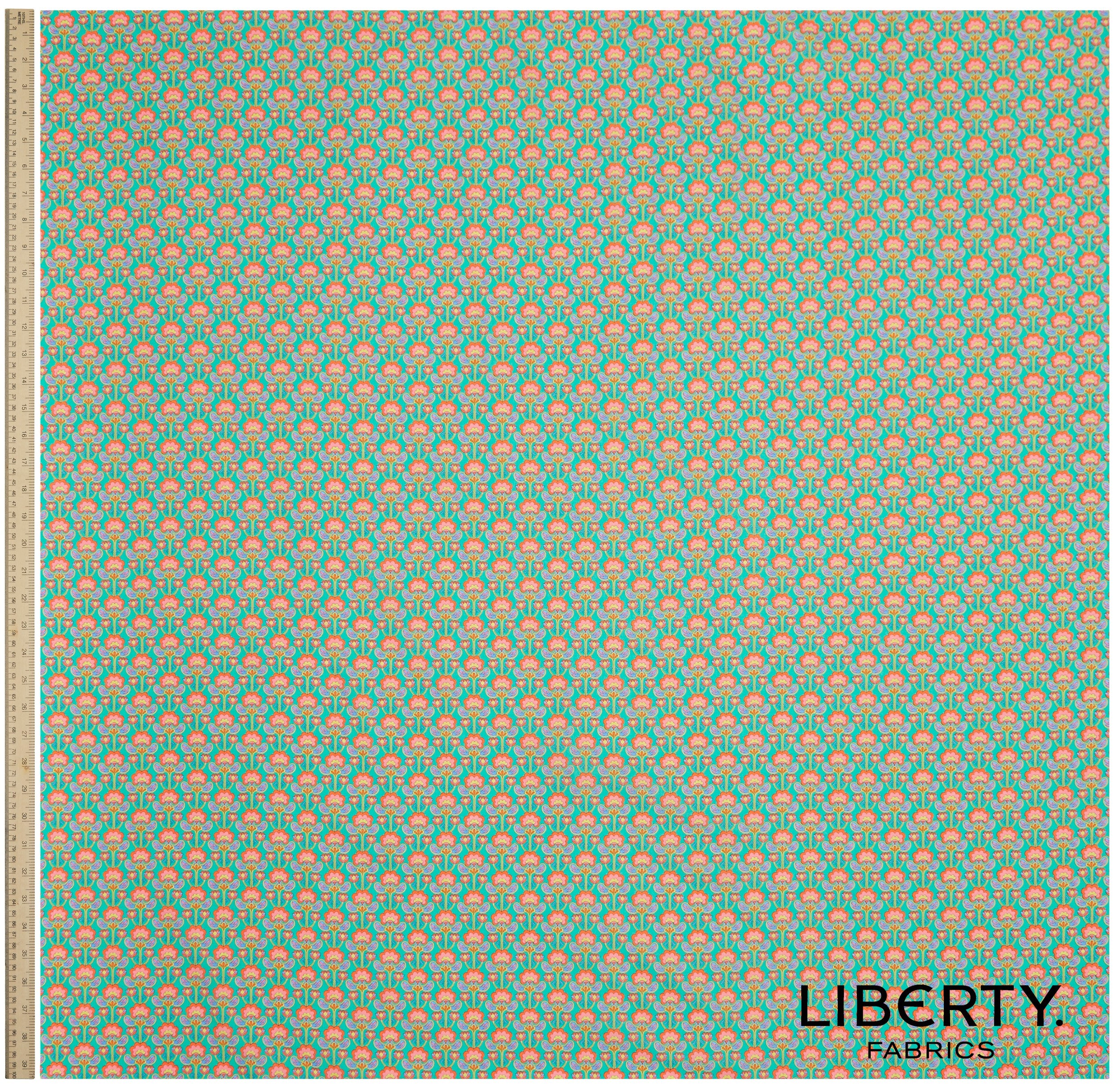 Peacock Posy is evocative of the flamboyant fashion of the 1960's peacock revolution, this small-scale bohemian floral captures the era's departure from traditional tailoring towards a more expressive, experimental style. Originally designed by Liberty in 1965 during the Art Nouveau revival years, Peacock Posy showcases a vibrant floral motif arranged in a strikingly graphic, repeating pattern.